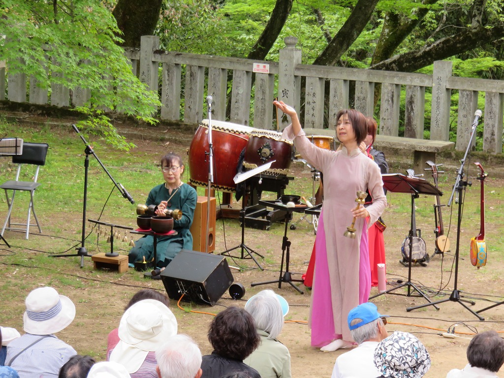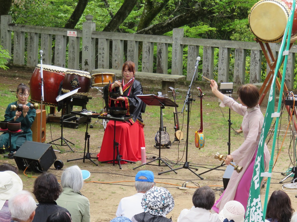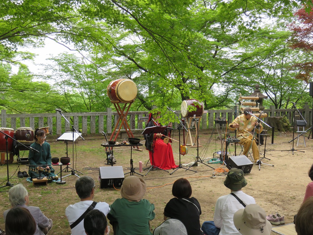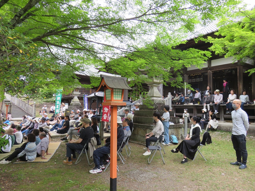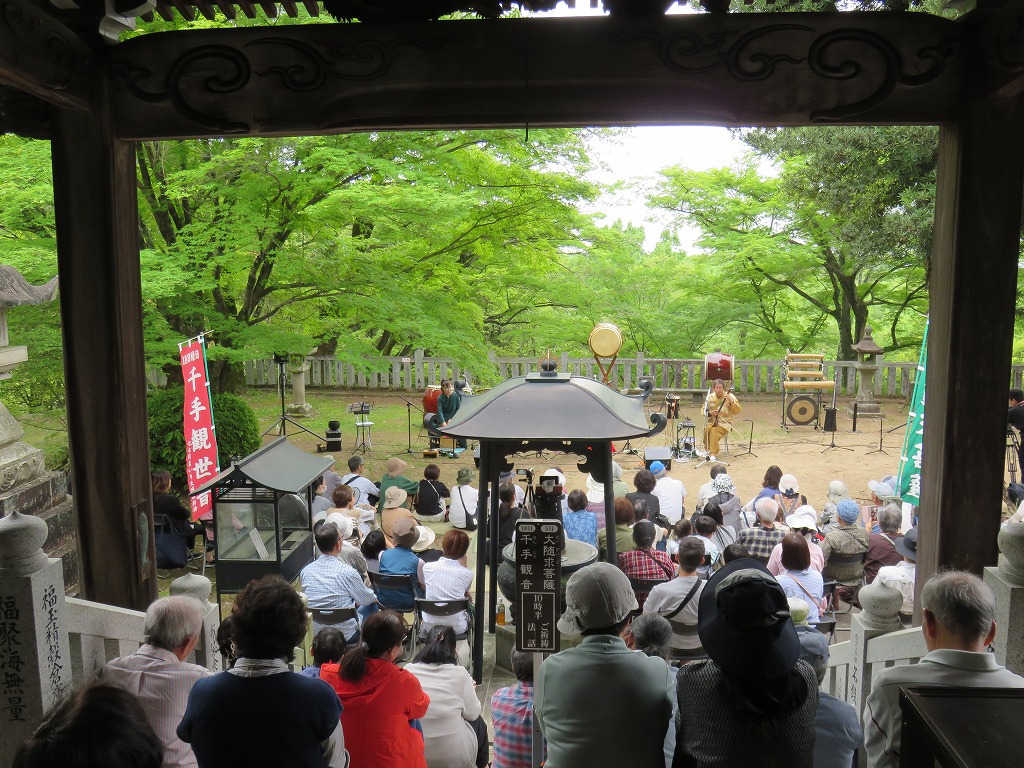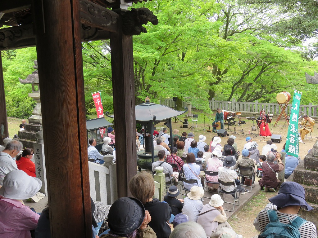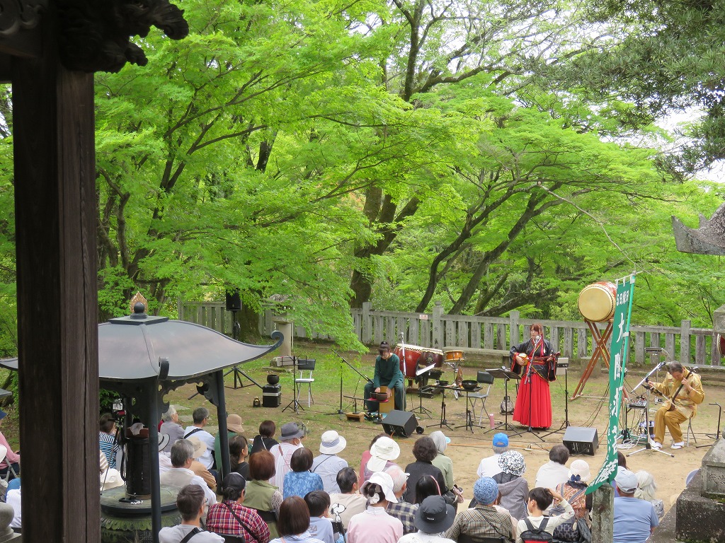 当日は曇りでしたが雨の心配はなく、山上本堂前、 新緑の「青もみじ」の下で2026年の「青もみじコンサート」が開催されました。 コンサートは、「胡弓と三線」+舞踏、続いて和太鼓の演奏でした。