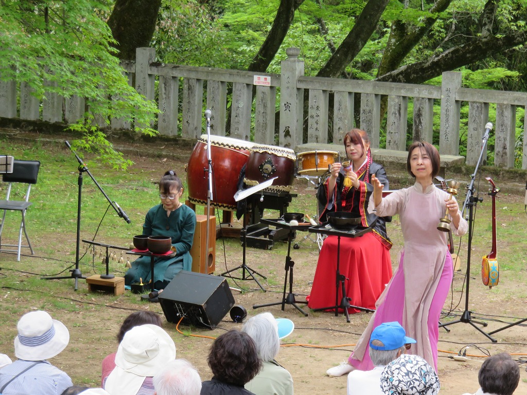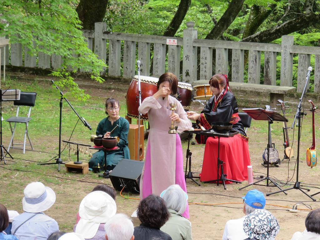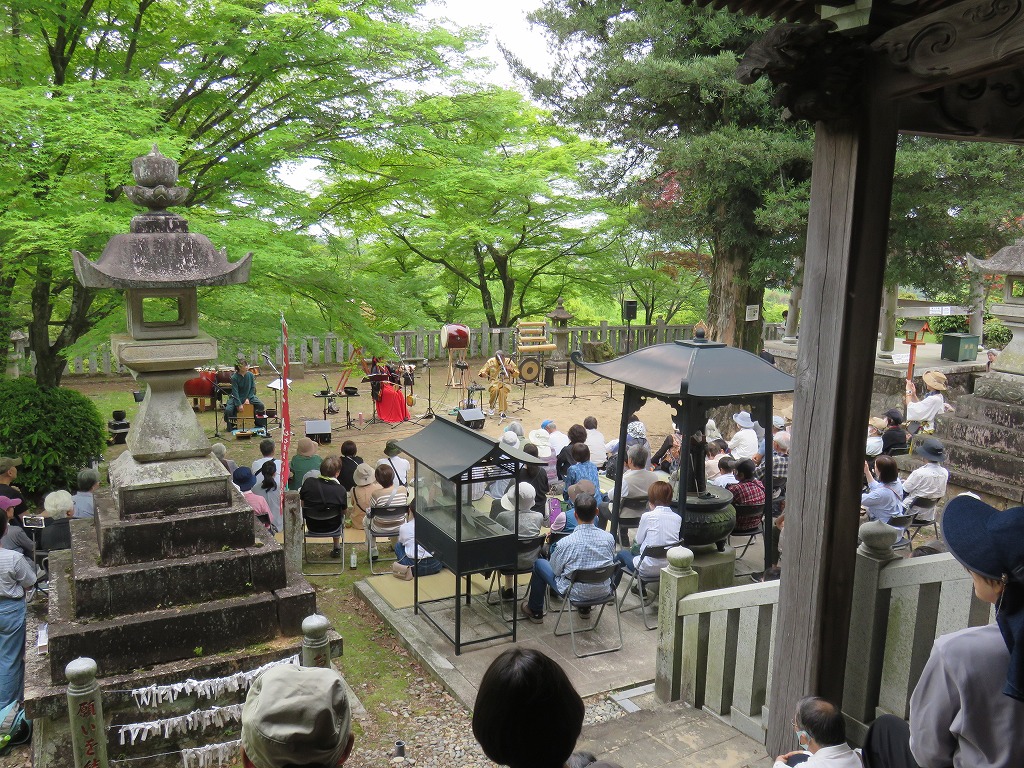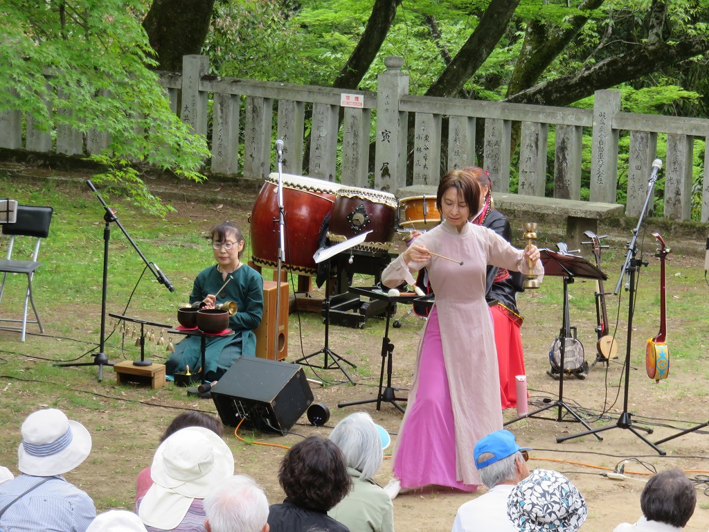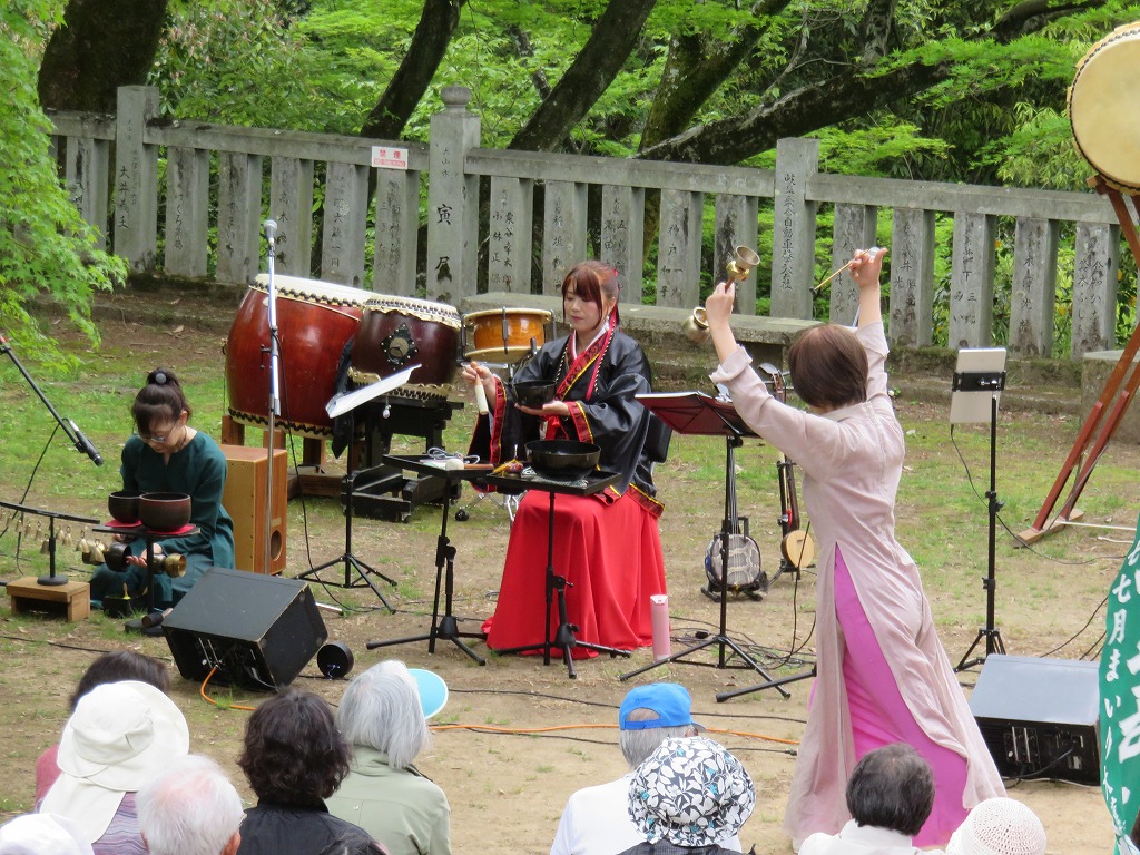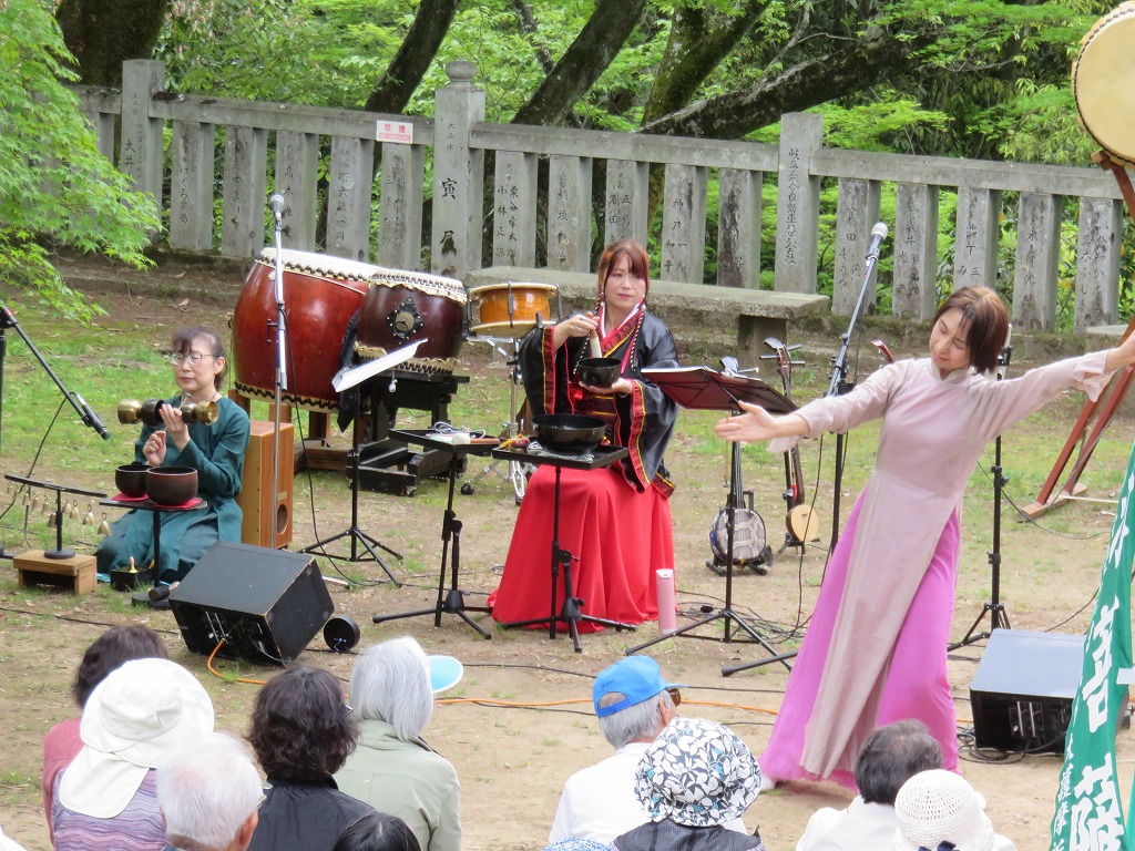 当日は曇りでしたが雨の心配はなく、山上本堂前、 新緑の「青もみじ」の下で2026年の「青もみじコンサート」が開催されました。 コンサートは、「胡弓と三線」+舞踏、続いて和太鼓の演奏でした。