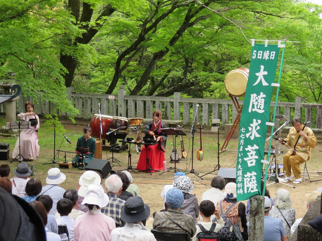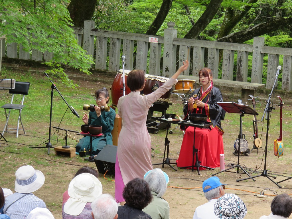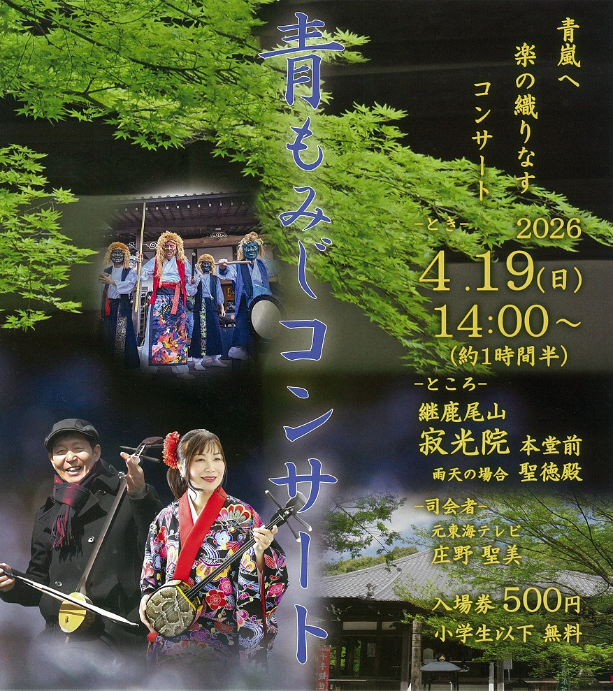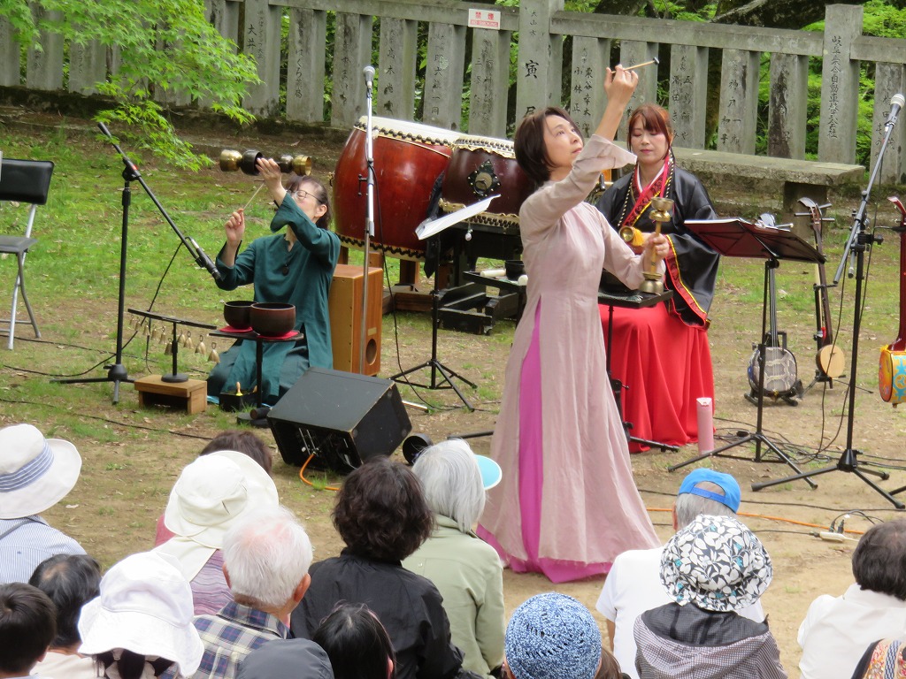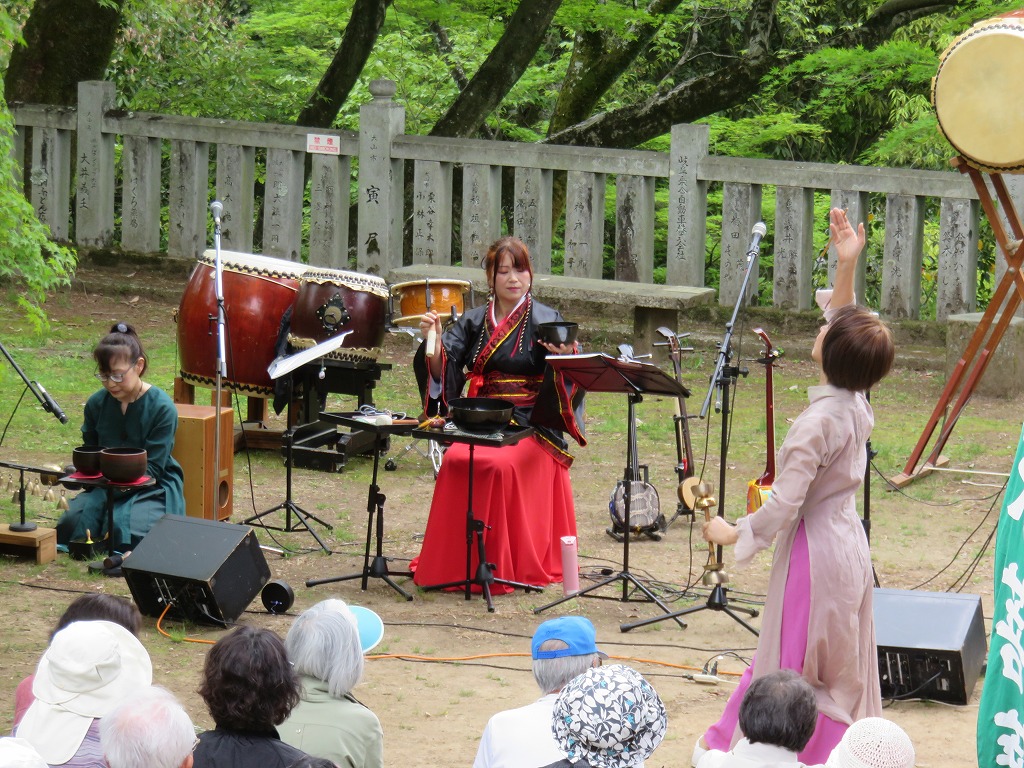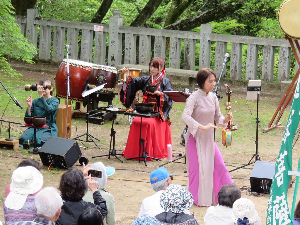 当日は曇りでしたが雨の心配はなく、山上本堂前、 新緑の「青もみじ」の下で2026年の「青もみじコンサート」が開催されました。 コンサートは、「胡弓と三線」+舞踏、続いて和太鼓の演奏でした。