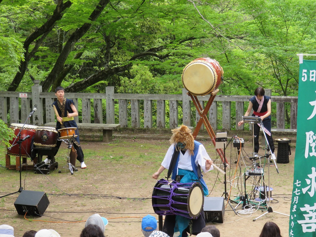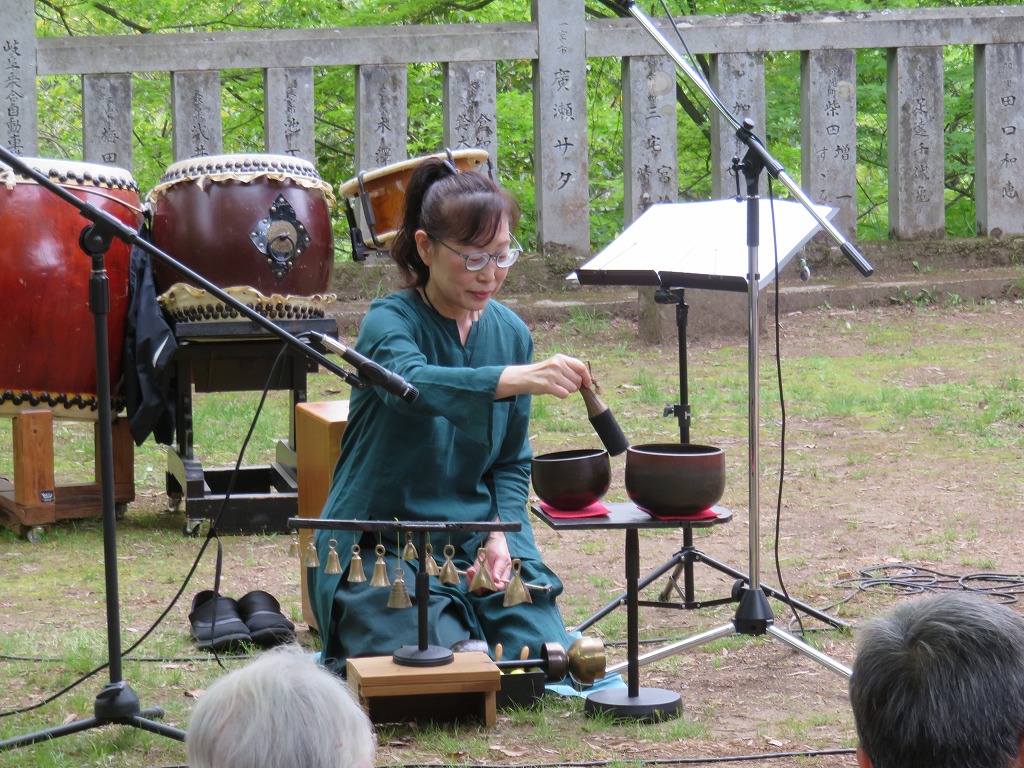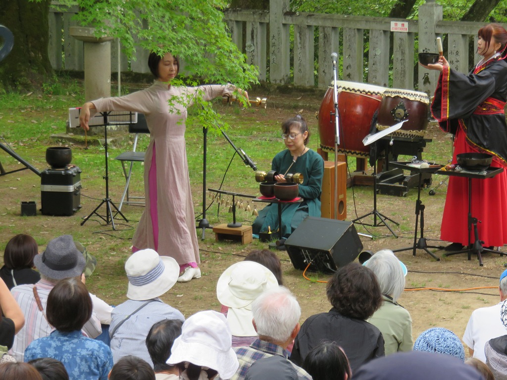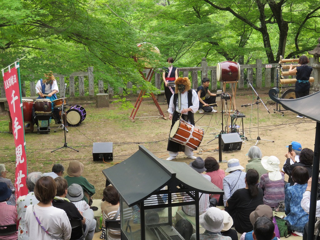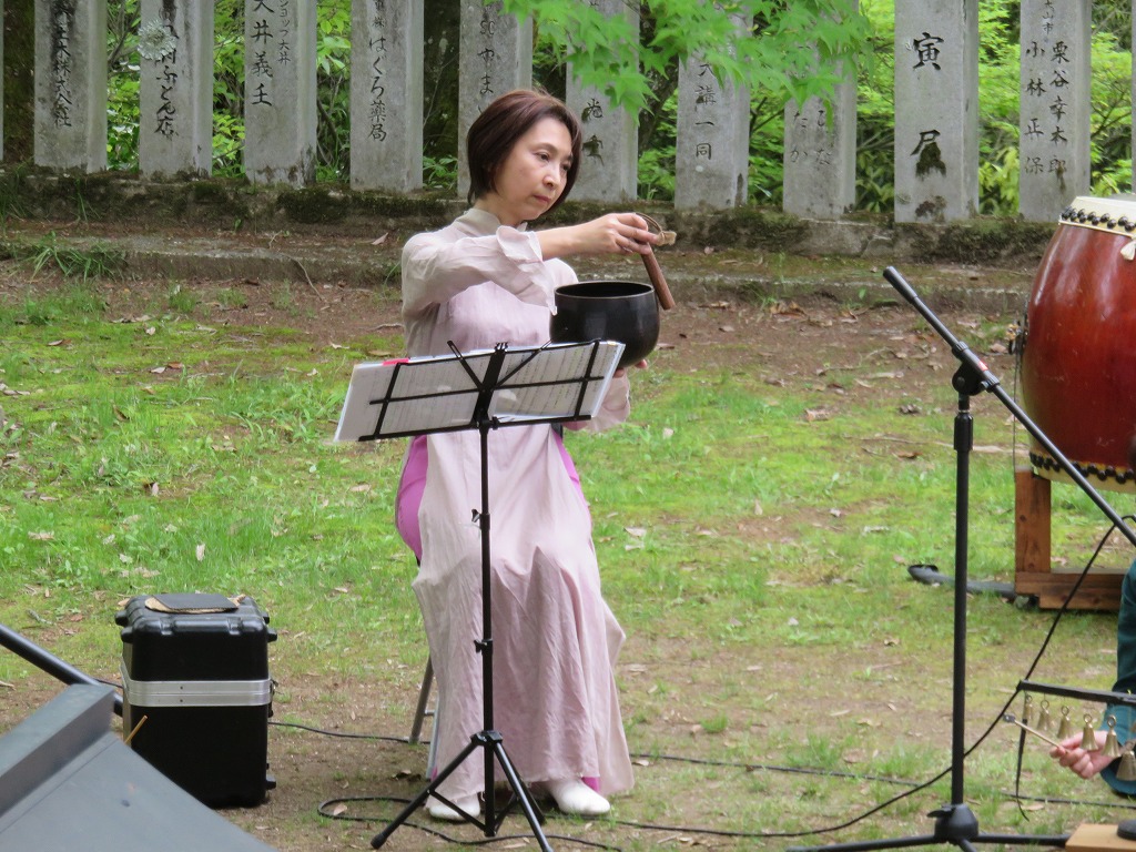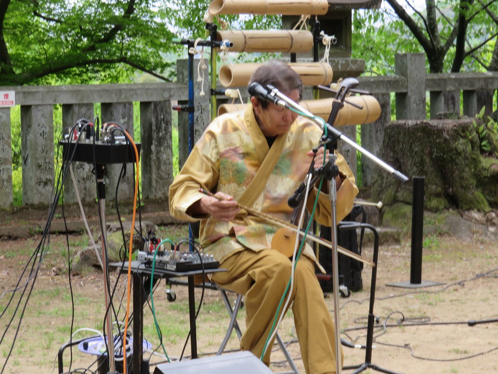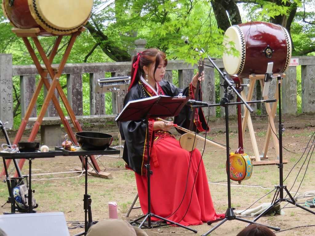 当日は曇りでしたが雨の心配はなく、山上本堂前、 新緑の「青もみじ」の下で2026年の「青もみじコンサート」が開催されました。 コンサートは、「胡弓と三線」+舞踏、続いて和太鼓の演奏でした。