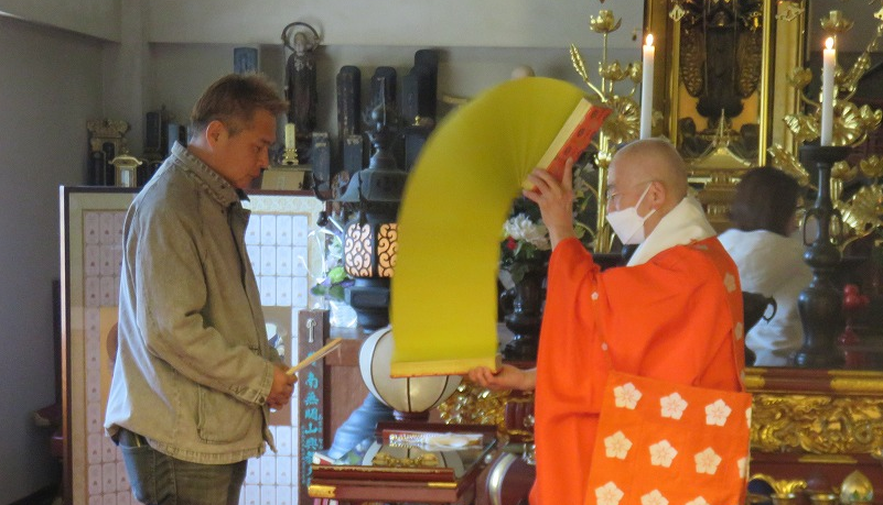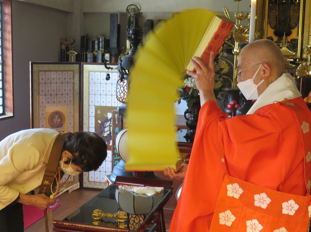 山麓の内仏堂では先ず松平實胤山主よりお一人お一人に「大般若経」転読のお加持を頂き、