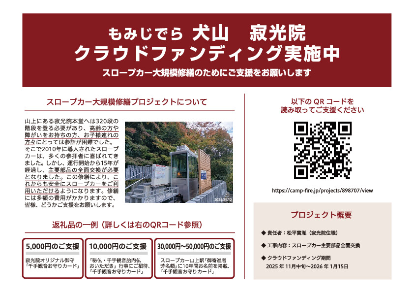 登るのに自信のない方、足のご不自由な方も本堂にお参りできますようにスロープカーを運行しております。