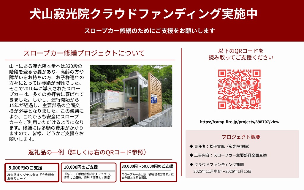 登るのに自信のない方、足のご不自由な方も本堂にお参りできますようにスロープカーを運行しております。